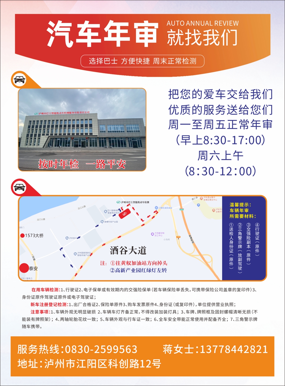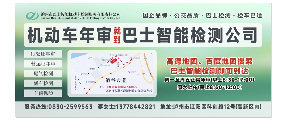 瀘州市巴士智能機動車檢測服務(wù)有限責(zé)任公司占地面積地20余畝,是瀘州市公交集團全資子公司,位于瀘州市江陽區(qū)科創(chuàng)路12號(高新區(qū)內(nèi))。檢測場站服務(wù)項目齊全、設(shè)備先進、管理規(guī)范、實力雄厚,檢測人員優(yōu)秀,技術(shù)力量精湛。本公司堅持“公正公平、科學(xué)準確、以人為本、高效服務(wù)”的宗旨,一切為客戶著想,全面為客戶提供規(guī)范檢測、誠信服務(wù),為受檢車輛提供可靠的檢測數(shù)據(jù),為瀘州市機動車安全運行提供支撐和保障。