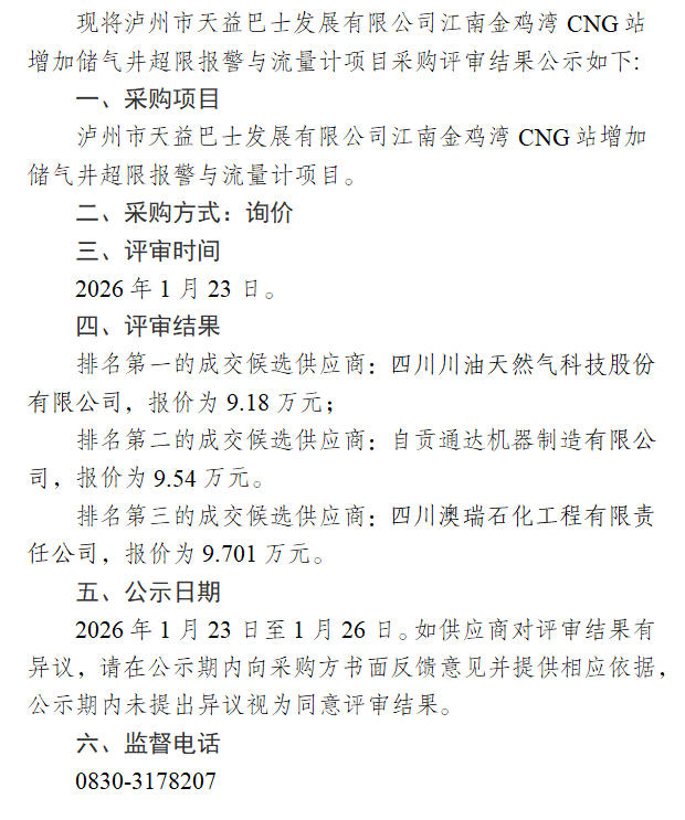 瀘州市天益巴士發(fā)展有限公司江南金雞灣CNG站增加儲(chǔ)氣井超限報(bào)警與流量計(jì)項(xiàng)目采購評審結(jié)果公示